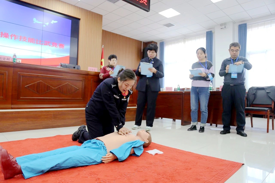 【市公安局举办AED设备使用技能比武竞赛】12月18日,全市公安机关AED(自动体外除颤仪)设备使用技能比武竞赛在潼关举办。特邀渭南市急救中心和红十字会专家担任评委。