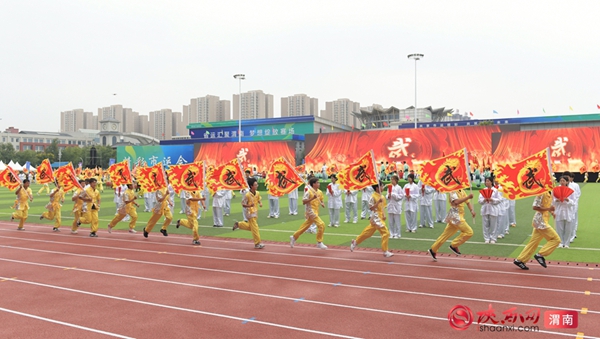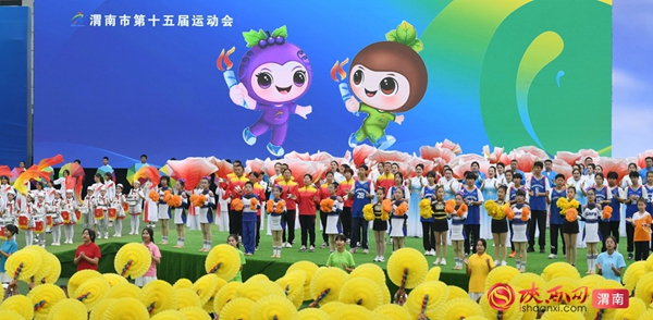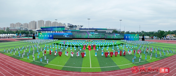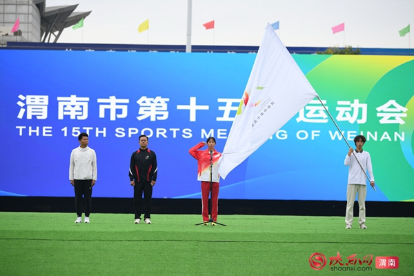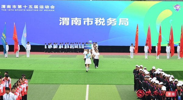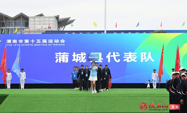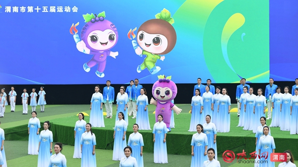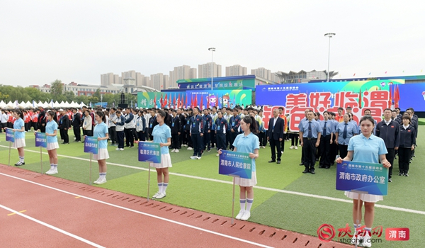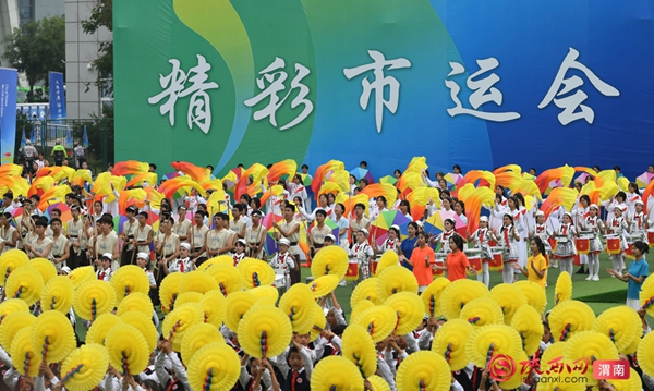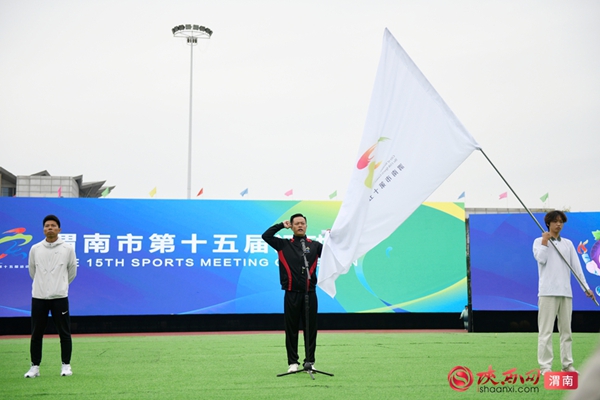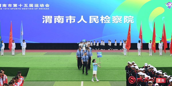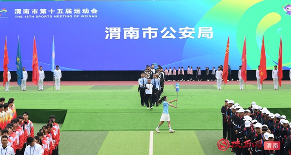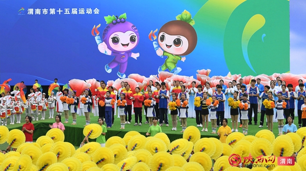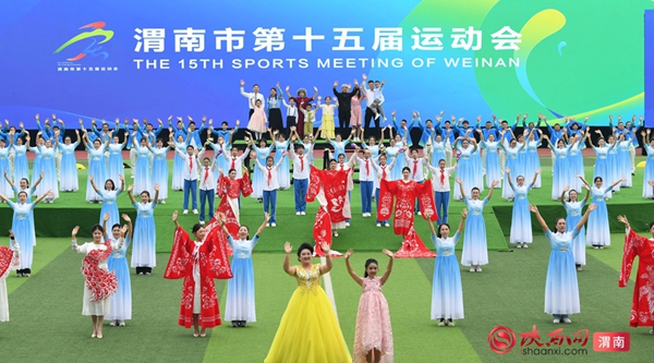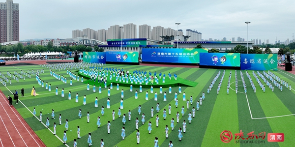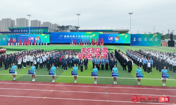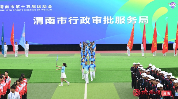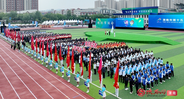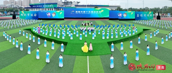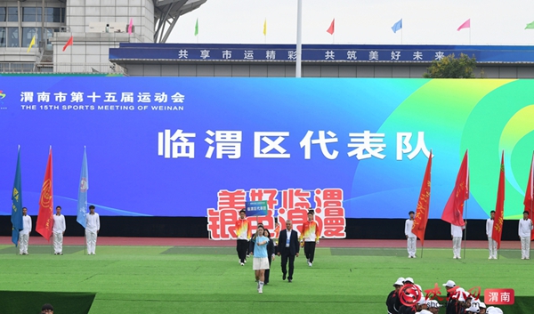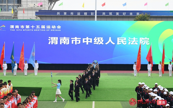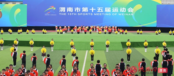 9时整,开幕式拉开序幕。迎接中华人民共和国国旗、渭南市运会会旗、渭南市第十五届运动会会旗;运动员、教练员、裁判员迈着整齐步伐依次入场;升国旗、奏唱国歌,升会旗、奏会歌。裁判员代表和运动员代表庄严宣誓后,开幕式大型主题表演正式开始。
