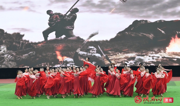 上篇《星火燎原 红色渭南》以红色歌舞、实景还原等形式,再现渭南革命时期的奋斗历程。伴随着激昂的旋律,演员们迈着坚定步伐奔向舞台。通过情景表演还原“渭华起义”“保卫潼关”的历史场景——“战士们”卧倒、冲锋,挥舞大刀与“敌人”对抗,背景投影中革命先辈的黑白照片与“星星之火,可以燎原”的红色标语交织,生动展现在中国共产党领导下,革命先辈在渭南播下红色种子、建立革命武装的峥嵘岁月。演到动情处,全场观众自发鼓掌,红色基因在体育盛会中得到深刻传承。