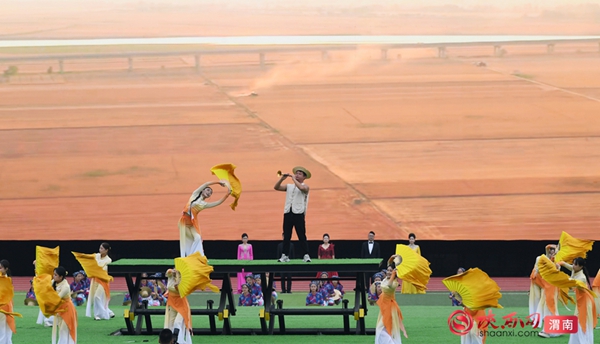 中篇《沃野千里 丰收渭南》聚焦本地农耕文明,结合民俗舞蹈、丰收场景演绎,尽显“关中粮仓”的物产丰饶与乡土风情。舞台上,演员们手持麦穗、草帽等道具,跳着欢快的民间舞蹈。“农民们”肩扛手挥锄头,模拟丰收的劳作场景,脸上洋溢着丰收的喜悦;背景投影中,金色的麦浪、硕果累累的果园与现代化农田灌溉设施交替呈现,既展现了传统农耕的质朴,也彰显了现代农业的发展成果,场面热闹祥和,充满生活气息。