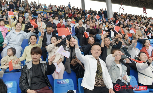 全场起立,在齐唱《歌唱祖国》的嘹亮歌声中,主持人宣布“渭南市第十五届运动会开幕式圆满结束”。现场人声鼎沸、掌声雷动,旗海、花海交织,场面震撼,为这场体育盛会画上了圆满的句号。