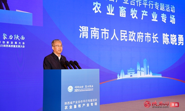 陈晓勇在致辞中首先向各位领导嘉宾表示欢迎与感谢。他说,渭南作为陕西东大门,区位优越,素有“三秦要道,八省通衢”之称;作为关中之腹地,山河相拥、沃土广袤;作为农业大市,历史悠远、农耕文明绵长。近年来渭南市深入贯彻习近平总书记来陕考察重要讲话重要指示,紧扣高质量发展主题,着力在农业强市建设上“蹚路子、作示范”,全力打造西部现代农业先行区,“渭南农业”已成全国闪亮名片。陈晓勇表示,举办此次专场推介旨在为渭南农牧业与企业家搭建对接合作平台,诚邀各位企业嘉宾到渭南实地考察,更加深入了解渭南、关注渭南、投资渭南。渭南市政府将当好“金牌保姆”,让企业家安心创业、放心发展、舒心生活,携手谱写互利共赢新篇章。