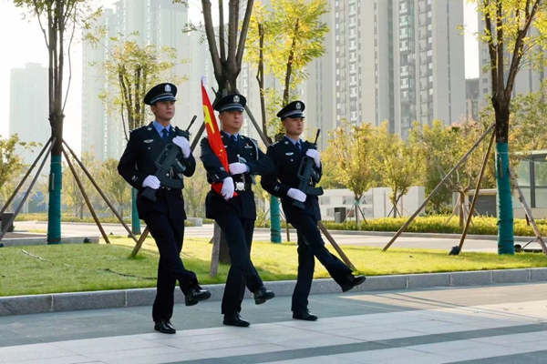 全体法官干警身着制服,胸前的法徽在朝阳下熠熠生辉,升国旗仪式在雄壮的《义勇军进行曲》中正式开始。由司法警察组成的国旗护卫队迈着铿锵有力的正步,护送国旗走向升旗台,当五星红旗冉冉升起时,全场干警肃立行注目礼,齐声高唱国歌,以最庄严的仪式表达对祖国的赤诚热爱和对法治事业的坚定信仰,国旗与法徽交相辉映,映照出法院干警忠诚、干净、担当的政治品格。
