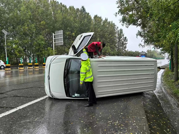 【蒲城公安交警暖心救援侧翻车辆】2025年10月6日,中雨天气,蒲城县公安局交通管理大队罕井中队民警在辖区开展在开展巡逻任务,行经201省道罕井段时,发现一辆汽车侧翻在路边,车内有人员被困。民警立即设置好安全警示标志,指挥后方车辆减速慢行,防止二次事故的发生,然后对车内被困驾驶员进行救援,并成功帮助其脱困。