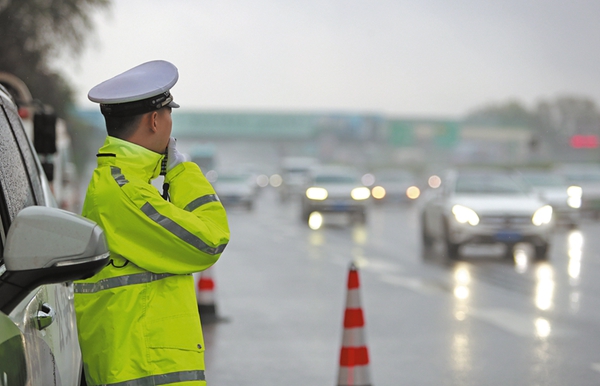 节日期间,市公安局交警支队高交大队以气象为令,启动恶劣天气一级勤务,加强路面管控,确保道路安全畅通。图为民警通过鸣警笛、亮警灯、喊话器提醒等方式,提醒过往车辆减速慢行,安全行车。