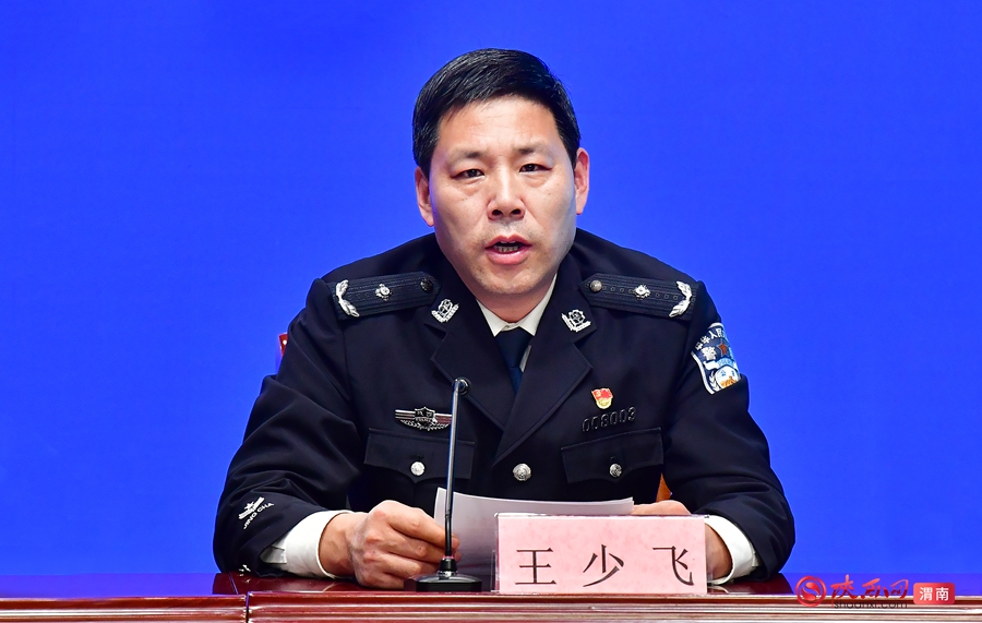 渭南市公安局党委委员、副局长王少飞回答记者提问。记者 罗娜 摄