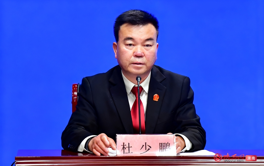渭南中院党组成员、政治部主任杜少鹏主持新闻发布会。记者 罗娜 摄