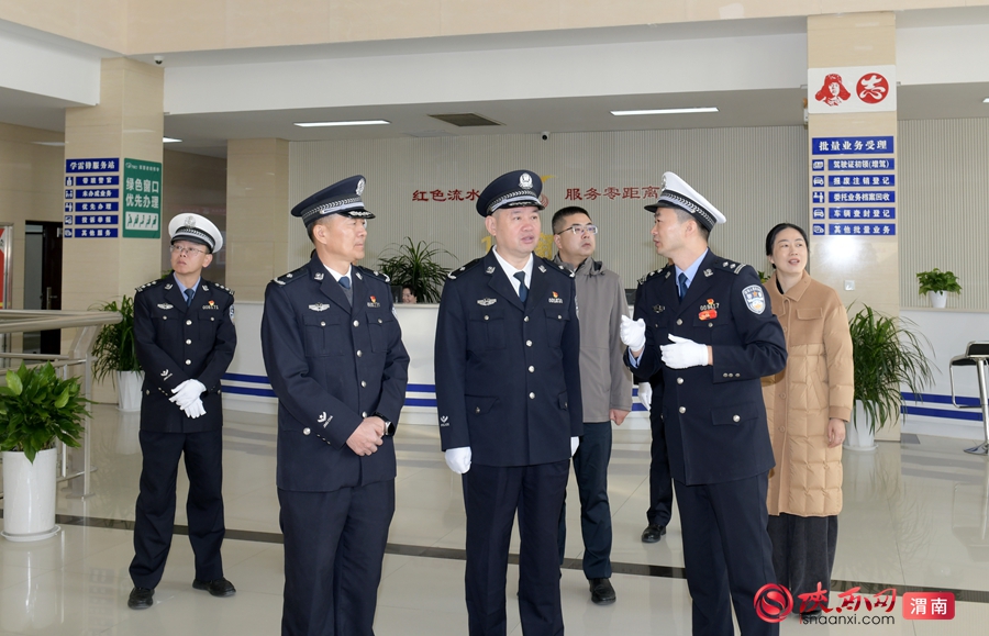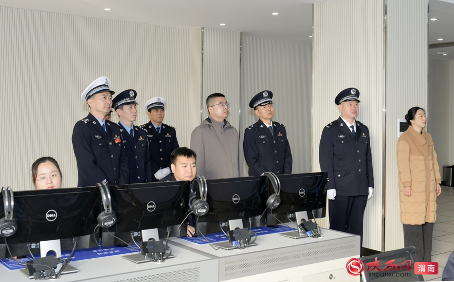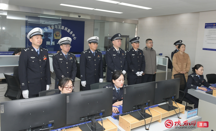 参加活动领导嘉宾观摩渭南市公安局交警支队车管所语音与互联网服务中心。记者 杨大君 摄