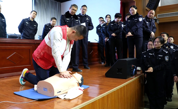 【华州公安开展第三期CPR+AED专题培训】按照政治工作服务保障公安工作现代化“八大行动”工作要求,全力推进急救技能培训工作,切实提高基层派出所应对突发心脏骤停事件的能力,12月1日,渭南市公安局华州分局特邀渭南市红十字会主任冯阳平为40余名基层派出所民辅警开展心肺复苏(CPR)与自动体外除颤仪(AED)专题培训。