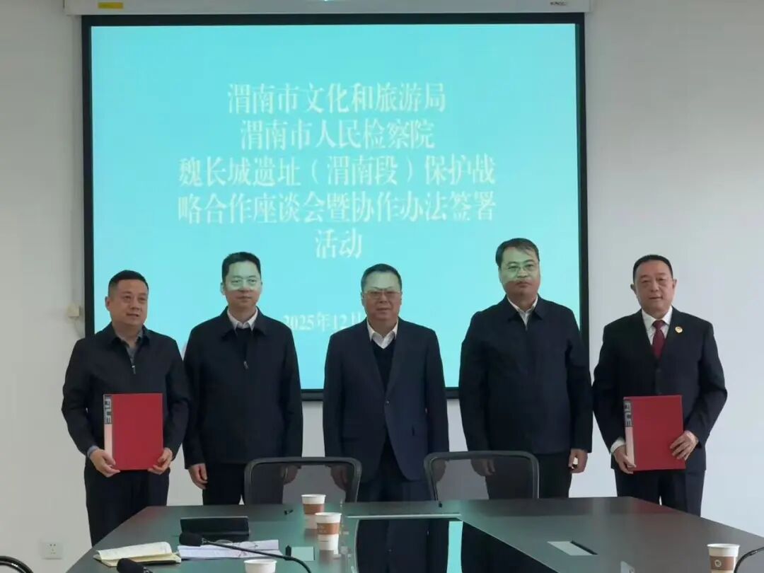 为进一步加强魏长城遗址(渭南段)的系统保护与活化利用,构建行政执法与检察监督高效协同的工作格局,2025年12月26日上午,渭南市检察院与渭南市文化和旅游局联合召开魏长城遗址保护战略合作座谈会。双方在会上正式签署《关于魏长城遗址(渭南段)保护的协作办法》(以下简称《协作办法》),标志着我市文化遗产保护跨部门协作进入制度化、规范化、常态化的新阶段。