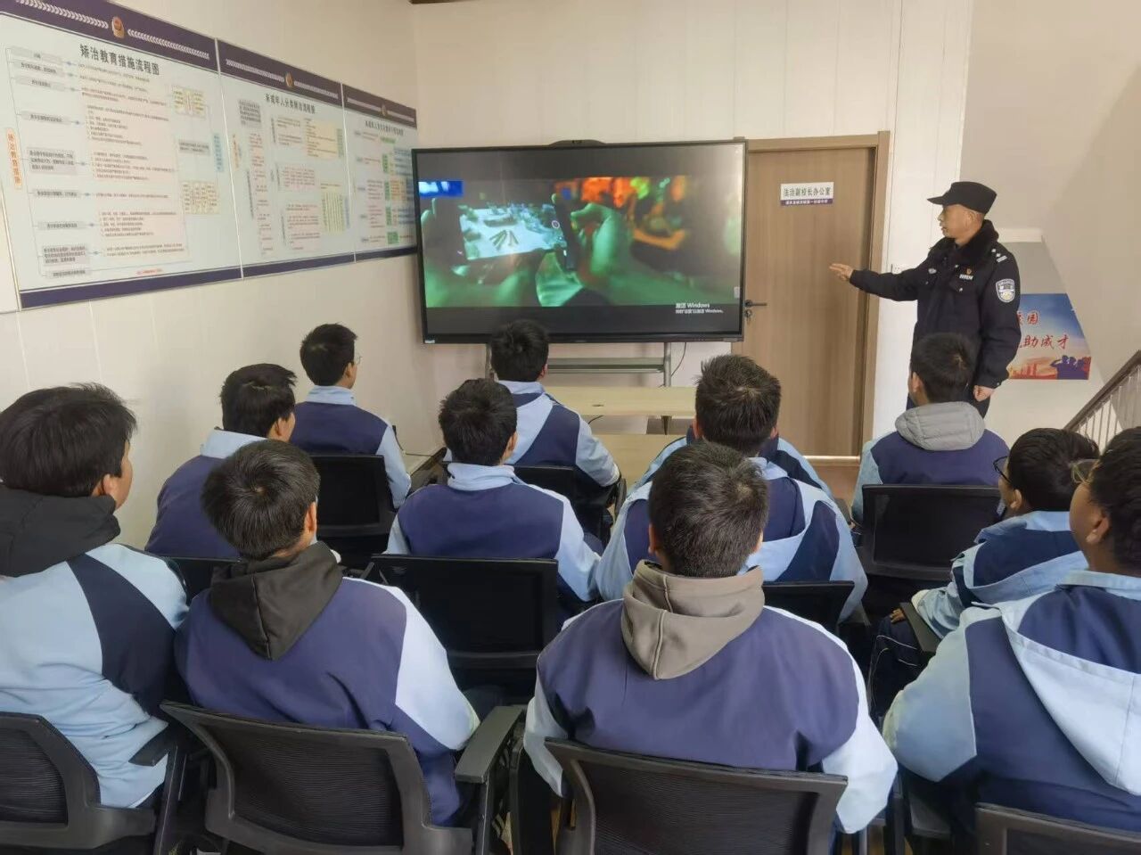 同时,治安大队依托“四室一体”新型标准化校园警务室,在县职教中心加挂“护苗工作站”,整合公安、教育力量联合办公,实现校园安全管理“零距离”;联合打造安全教育文化长廊,覆盖禁毒、反诈、防性侵等七大主题,以沉浸式、矩阵式宣传,让法治安全知识入脑入心;选派骨干民警担任法治副校长,常态化开展“法治进校园”宣讲,用鲜活案例为青少年普及法律常识,引导其知法、懂法、守法、用法。