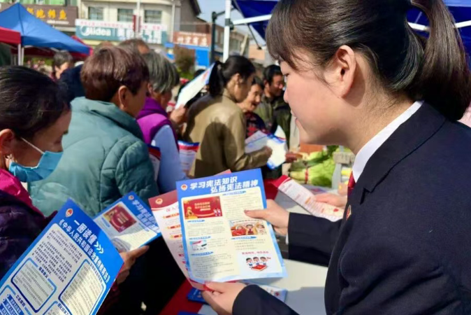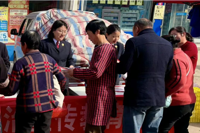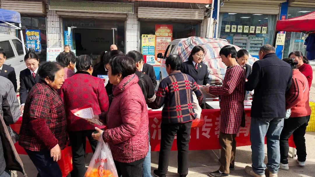 崇凝镇集市人流量大、商户集中,是当地群众日常采购、交流往来的核心区域,也是普法宣传的关键阵地。活动现场,干警们因地制宜,在集市中心位置设立集中咨询台,悬挂普法宣传横幅,摆放《中华人民共和国民法典》《陕西省秦岭生态环境保护条例》《中华人民共和国未成年人保护法》等宣传手册,形成了一处便捷的“法治便民点”。热闹的集市中,鲜艳的宣传资料吸引了众多群众驻足,干警们主动上前,将普法资料发放到赶集群众、商户手中,开展“点对点”普法。